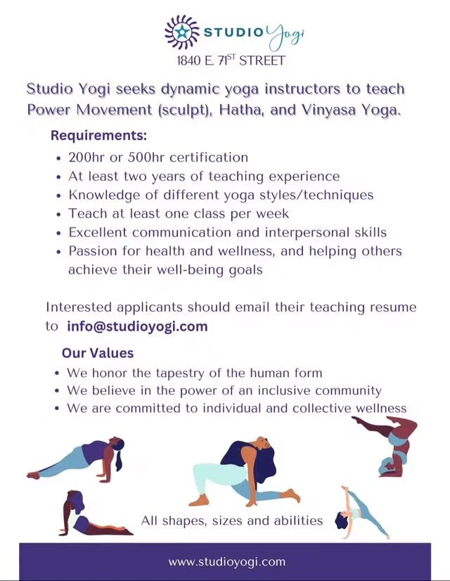 Studio Yogi in Chicago’s South Shore neighborhood is looking for yoga class instructors apply today.